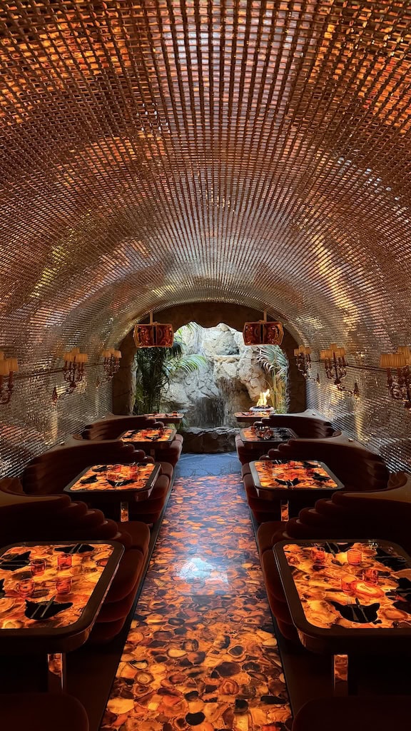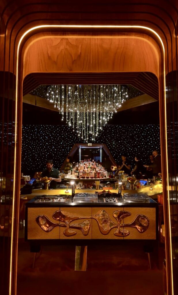Walking through the doors feels like stepping into another dimension — an elegant, retro-futuristic space complete with a disco ball cave, sleek design details, and the kind of ambiance that instantly transports you.
